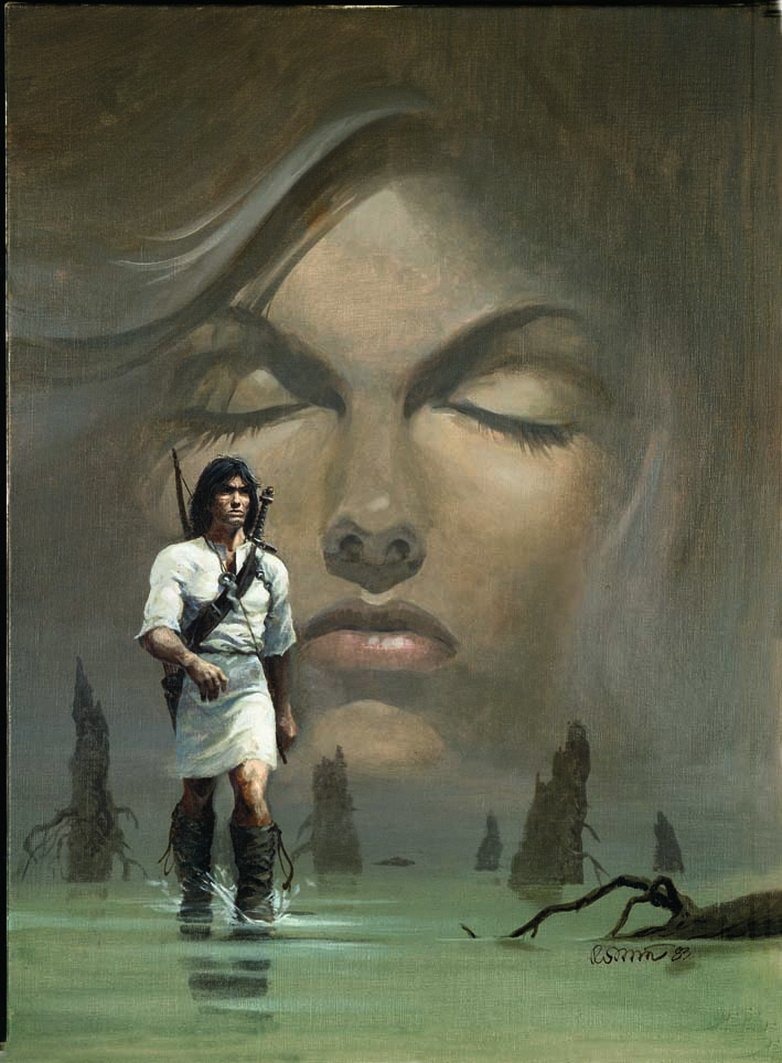 Vue et revue, cette image reprend deux scènes de l’album pour les lier en une seule. Thorgal s’engage dans le marais maudit, résolu, à nouveau vivant. Le visage d’Aaricia l’accompagne dans sa quête, le beau visage endormi de son épouse, qu’il croyait morte.