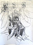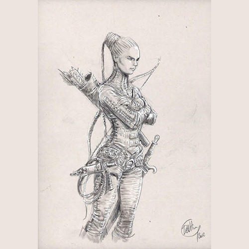 Viennent ensuite plusieurs dessins préliminaires, toujours sur papier, en couleurs cette fois. Les détails, la posture, l’ambiance se précisent.