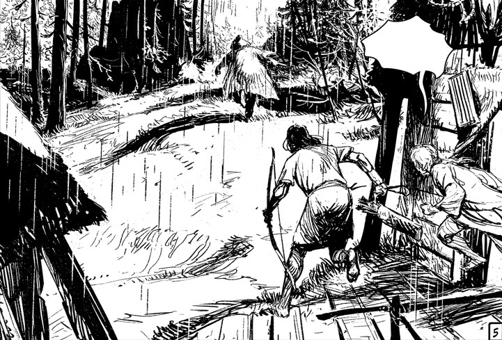 L’autre case chahutée pour la bonne cause est la troisième. La proposition de Yann rappelle un exercice qu’apprécie beaucoup son autre dessinateur, Roman Surzhenko (La jeunesse de Thorgal, Louve), une case contrastée où seuls les personnages sont dessinés en noir profond sur fond blanc, sans cadre (voir ci-contre). Préférant rester au plus près de ses personnages, Fred Vignaux a choisi de ne pas reprendre la technique pour cet album.