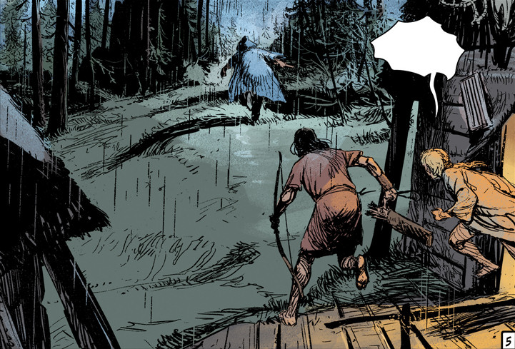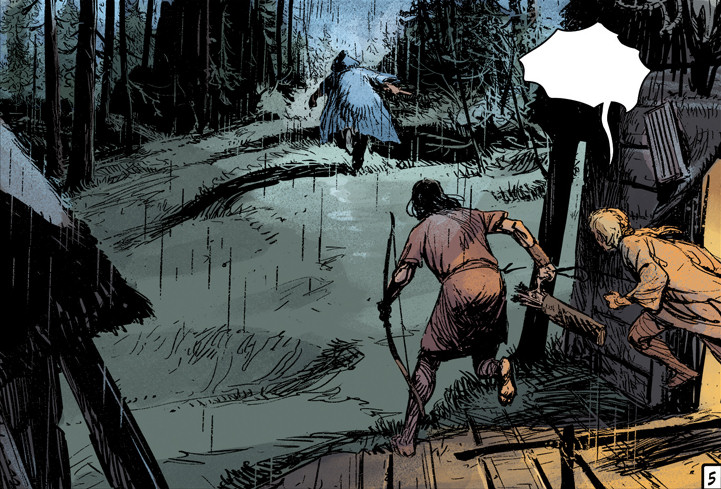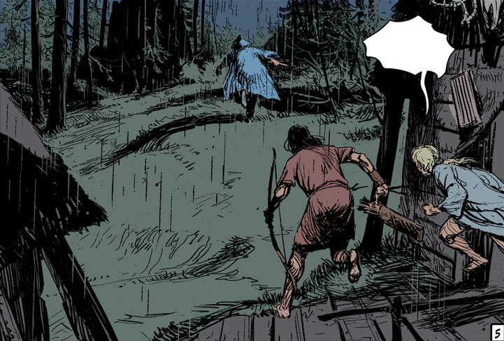 Thorgal et Jolan réagissent rapidement en prenant en chasse l’inconnu qui a tenté de les assassiner !
