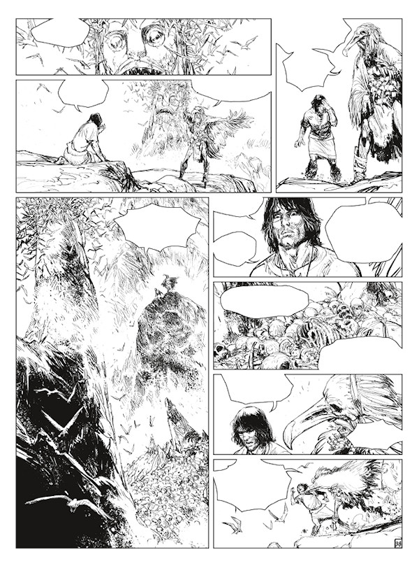 On peut notamment remarquer le soin mis par l’auteur pour fusionner les éléments. La barbe, les plumes, l’os, font du vieil ermite une montagne vivante. Tout comme Rosinski depuis quelques années, Vignaux n’hésite pas à laisser certaines parties de l’image, comme les jambes de Thorgal, seulement esquissées.