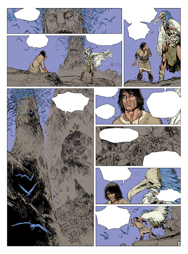 Par rapport au scénario originel, on voit dans la case 4 que la montagne sacrée n’est plus un îlot surgissant des flots, mais un mont perdu dans le blanc. On voit aussi que le dessinateur laisse beaucoup de zones blanches, sans décor visible, ce qui permet au dos de Thorgal de se découper nettement. Le gros plan sur la montagne sculptée lui donne le rôle principal de la planche. C’est l’aboutissement de la quête et, puisque Thorgal vient à l’instant de survivre avec peine à une attaque d’oiseaux, la statue géante devient une sorte de divinité fabuleuse recouverte par son armée à plumes.