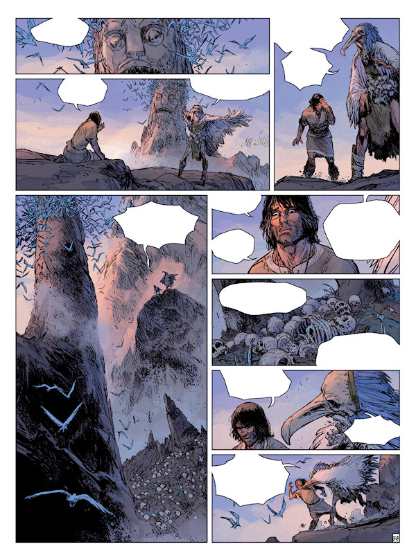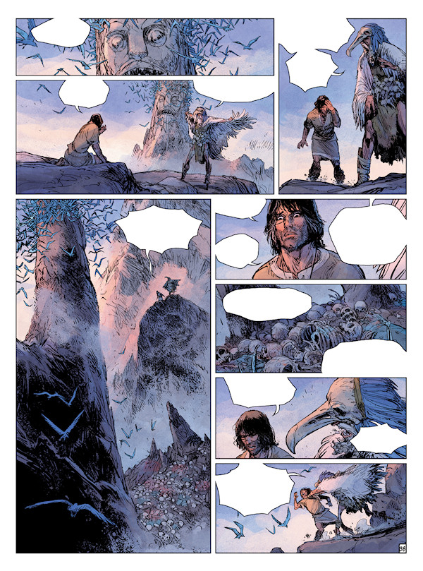 L’autre choix fort du dessinateur est d’avoir scindé en deux la découverte de la montagne à tête humaine. Thorgal la découvre tout d’abord de loin, dans son environnement, avant qu’un plan resserré nous permette d’apprécier de plus près l’aspect du rocher, et les oiseaux qui s’y agitent.