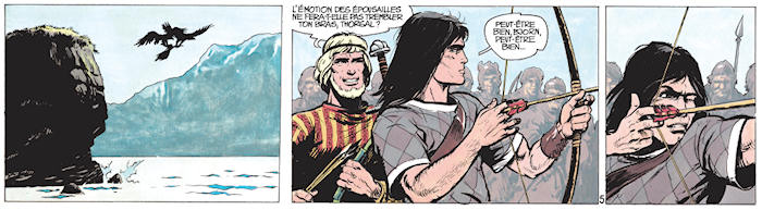 Le jeu auquel participent Thorgal et Bjorn, au début de l’album, semble avoir attiré une grande partie des membres du clan. Guerriers, femmes et certainement enfants sont là, jeunes et vieux, et même le roi Gandalf, pourtant si fatigué. Un tournoi d’archers a été improvisé après la capture d’un aigle majestueux, une belle occasion pour s’exercer et tenter d’impressionner l’assemblée des Vikings.