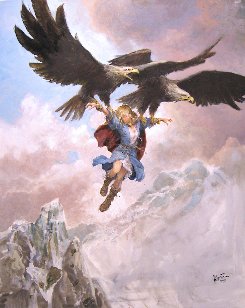 La première, tout en représentant l’enlèvement d’Aaricia, offre à celle-ci l’une de ses plus belles scènes. Portée par de majestueux oiseaux, magnifiée par le cadre de montagnes et de ciel qui se rejoignent et s’entremêlent, la princesse captive devient simplement magnifique.