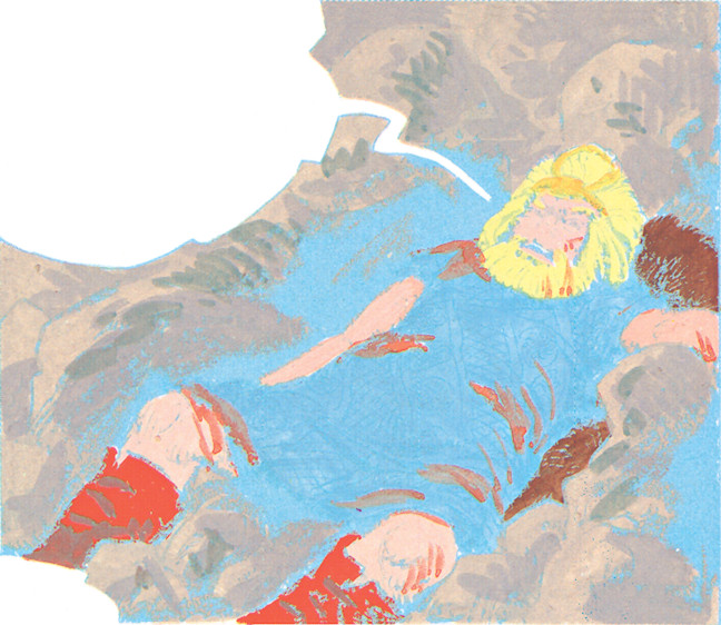 Dans la première case, on peut remarquer que les compagnes d’Aaricia les plus détaillées sont mises en couleur de façon plus précise que dans la planche originelle, mais aussi que les silhouettes moins détaillées sont pour le moment fondues dans l’arrière-plan. C’est pourquoi quelques traits noirs se promènent dans le ciel bleu.