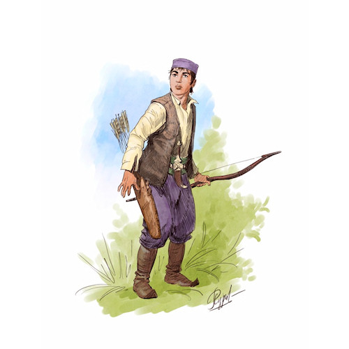 Le personnage central masque son visage avec sa flèche — la touche de mystère.