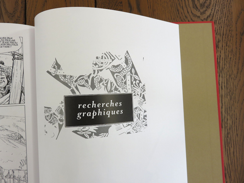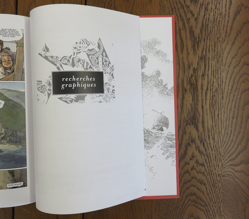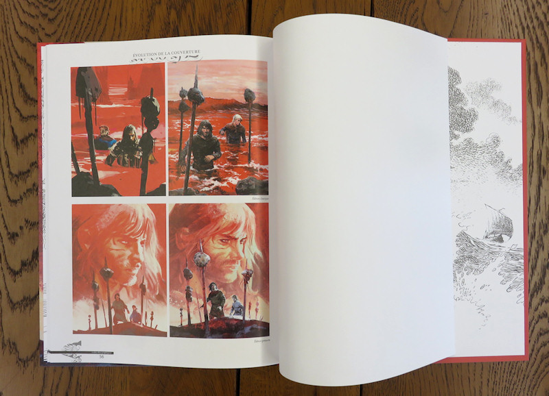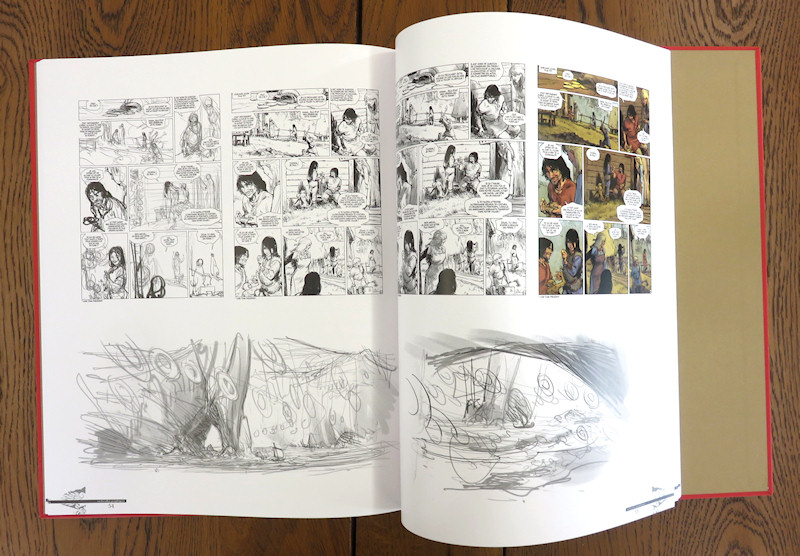 On retrouve notamment une page complète du scénario, accompagnée des esquisses préliminaires et de la planche encrée en noir et blanc. Différents travaux de recherche de Vignaux sont exposés sur les pages suivantes.