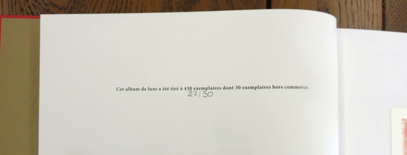 L’album est limité à 400 exemplaires, et 30 exemplaires hors-commerce. Celui qui vous est présenté ici fait partie de ces derniers, et le numéro s’affiche en ouverture du livre et sur l’autocollant de la pochette de protection.