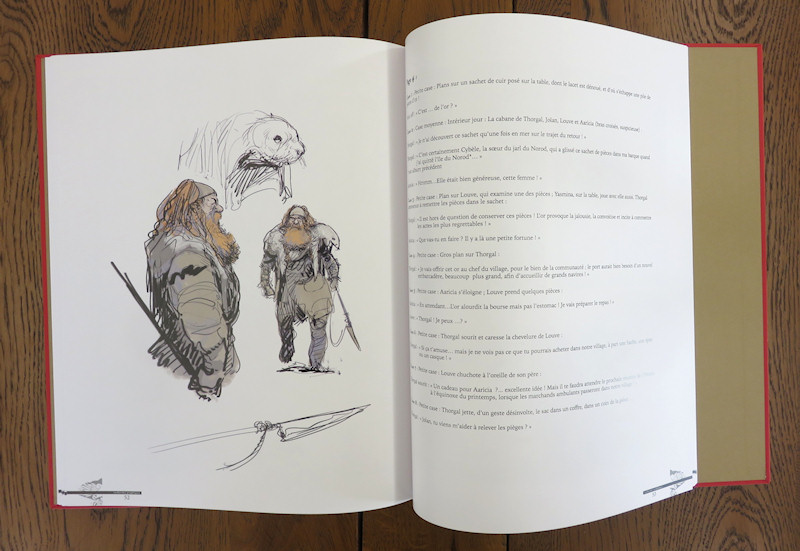 On y retrouve des esquisses, parfois en couleurs, mais aussi des extraits du scénario écrit par Yann.