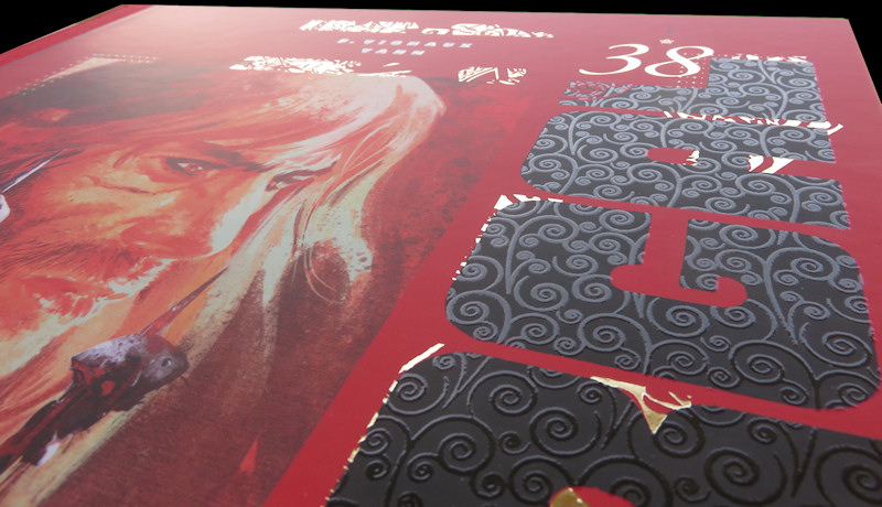 Voyons voir de plus près. La couverture a plusieurs vernis sélectif. Un vernis mat, globalement, sur l’ensemble. Des dorures à chaud, appliquées en divers endroits, comme on peut le voir ci-dessous. Et un vernis noir ayant un bel effet, sur les lettres qui nous intéressent le plus. Thorgal ! Le vernis dessine des arabesques élégantes.