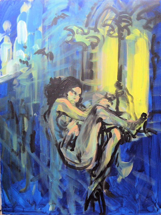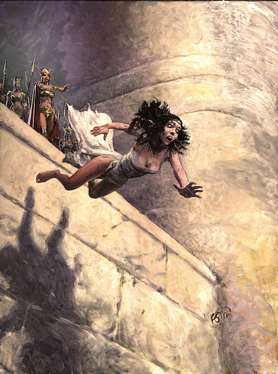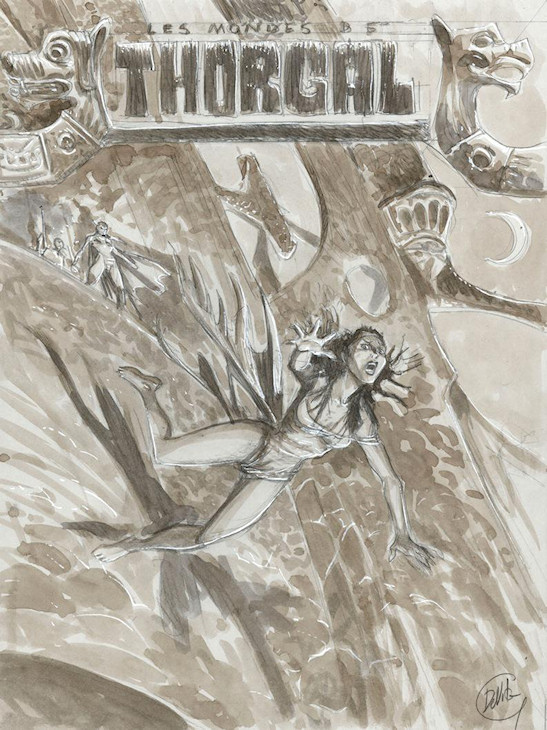 Voici différentes étapes de réalisation de cette belle couverture. Vous pouvez cliquer sur ces images pour les agrandir. La première étape est une recherche de Rosinski basée sur les premières planches de De Vita. De nuit, Kriss s’échappe de sa cage dorée en se tenant à sa corde de fortune. Cela rappelle la fuite de Thorgal en couverture du tome 3, « Les trois vieillards du pays d’Aran ». La lumière de cette scène lui aurait certainement donné de belles couleurs et de beaux contrastes.