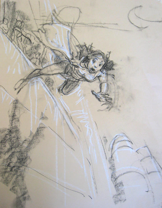 La deuxième étape est l’esquisse originelle de De Vita, la chute vertigineuse de Kriss. Très dynamique, cette scène est reprise dans l’album.