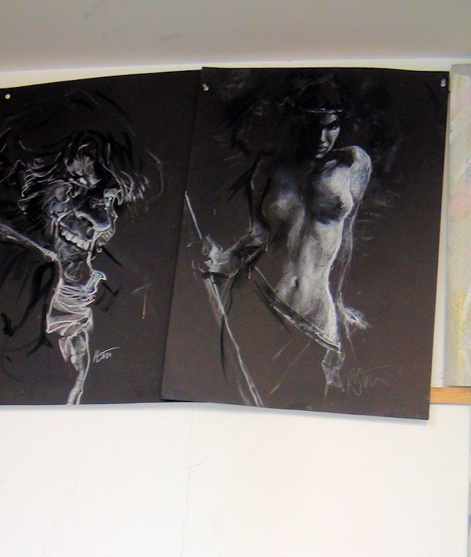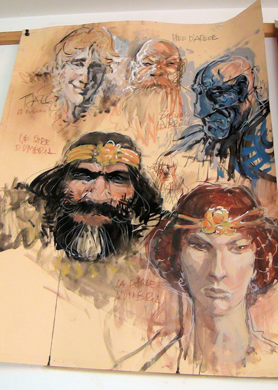 Voici deux vues de l’atelier de Grzegorz Rosinski, avec au mur deux des œuvres que l’on retrouve dans l’album (cliquez pour agrandir).
