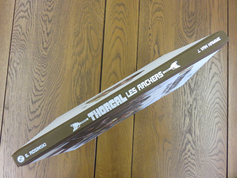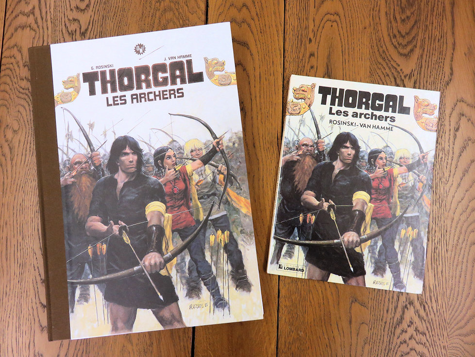 On trouve au dos un joli visuel de Thorgal, en couleurs (cliquez pour agrandir). Pour comparaison, voici l’album à côté de l’édition originale de « Les archers », parue en 1985.