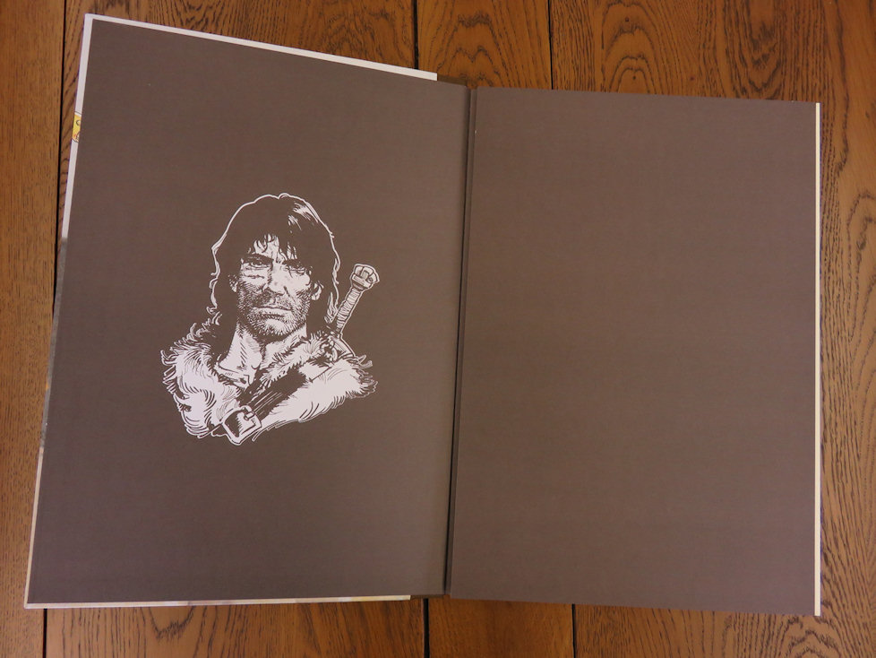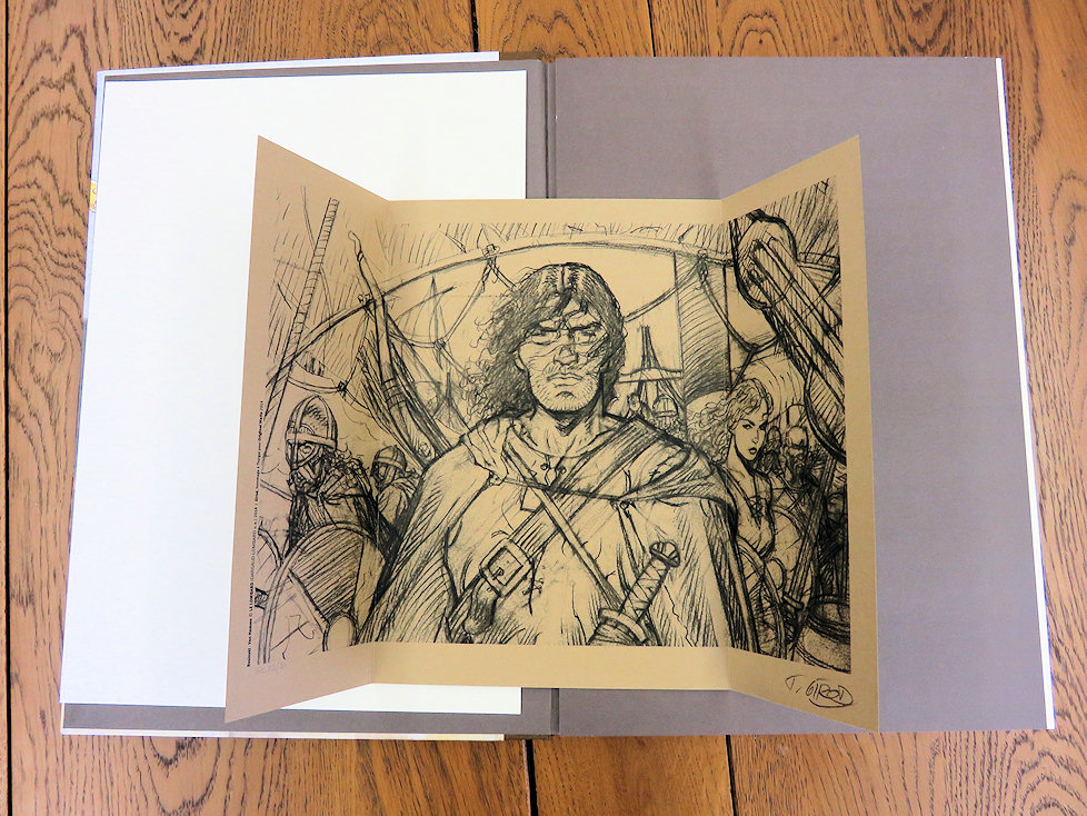 L’objet est lourd ! A l’ouverture, deux tirés à part sont glissés sous la couverture. Une fois retirés, on retrouve le Thorgal de couverture, en version noir et blanc sur fond marron.