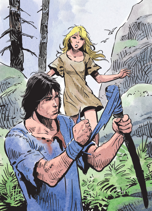Derrière les deux personnages, la nature est plus esquissée que représentée. Elle forme un cadre qui vient souligner l’essentiel, Aaricia et sa robe flottante étant placées au cœur de la composition. Thorgal conserve sa tunique tachée de sang tout au long de l’épisode. Un héritage des terribles combats du tome précédent !