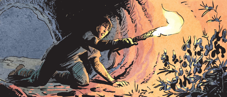 Ici, la flamme de la torche décide de se qui se voit, et de ce qui reste dans l’ombre, ce qui permet une belle diversité dans l’encrage. Les couleurs étant les mêmes pour l’eau et la roche, c’est également l’encrage qui permet de les différencier.