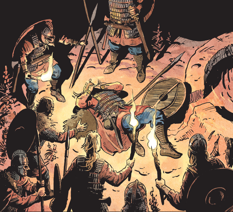 Restons dans la lumière, avec une dernière image assez compliquée, puisque les sources lumineuses y sont multiples. C’est aussi l’occasion d’observer l’équipement porté par les Vikings. Contrairement à la série originelle de Rosinski et Van Hamme, la Jeunesse de Thorgal place l’action dans un monde viking qui se veut proche de la réalité. La reconstitution s’efforce donc de suivre un cahier des charges assez précis, basé sur les recherches effectuées par les auteurs. Thorgal chez les Vikings, c’est ici !