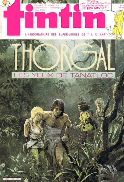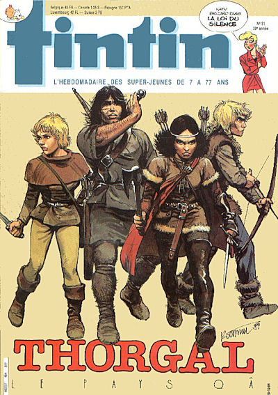 Deux albums dans la même année, en 1986, c’est un événement pour la série Thorgal ! Après « Le pays Qâ » en avril, voilà déjà la suite des aventures en terres chaams de Kriss, Thorgal et leurs compagnons d’infortune. Comme à ses débuts, Thorgal continue d’être prépublié dans la revue Tintin éditée par Le Lombard. A l’époque Tintin est l’un des magazines BD les plus connus en Europe de l’ouest, en kiosque depuis des décennies. Même si la revue vit ses dernières années — elle sera remplacée en 1989 par Hello Bédé, puis s’arrêtera définitivement en 1993 — elle propose encore la découverte en avant-première des albums et des talents de la maison d’édition.