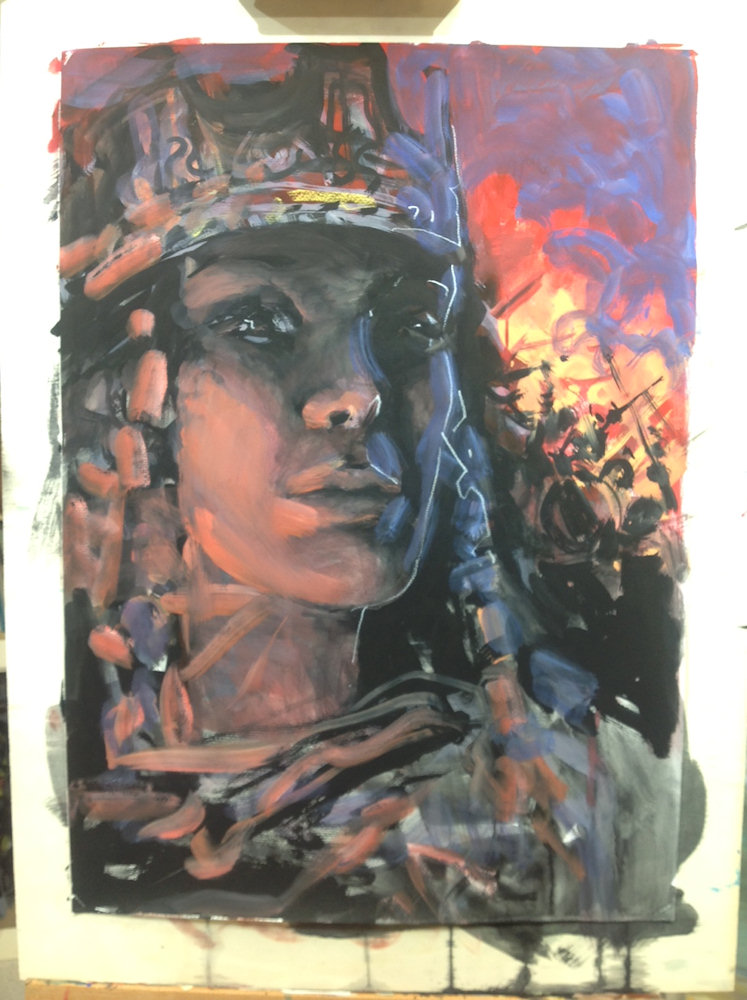 Cette couverture est l’œuvre de Grzegorz Rosinski, le dessinateur de Thorgal. Ces premières images sont des esquisses préparatoires assez abouties, des tests de mise en scène. Le cadre est déjà défini, ce sera Kriss en gros plan, accompagnée de combattants, le tout dans des teintes sombres et rougeâtres.
