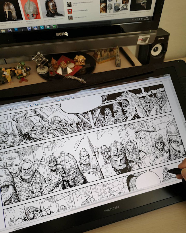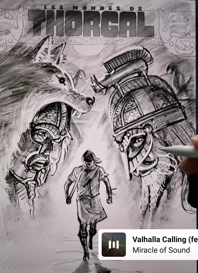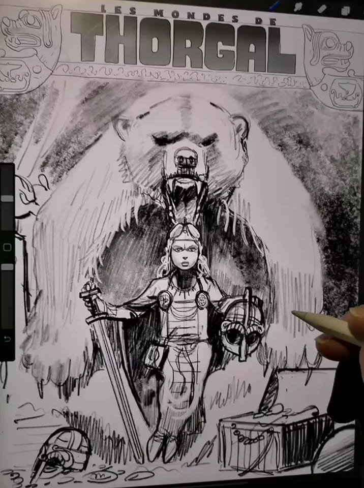Le dessinateur de La jeunesse de Thorgal partage également avec nous des étapes de son travail, comme cette planche en cours de réalisation ou ces deux propositions de couverture. La seconde a beaucoup plu à Grzegorz Rosinski, qui s’en est inspiré pour peindre la toile réalisée pour cet album.