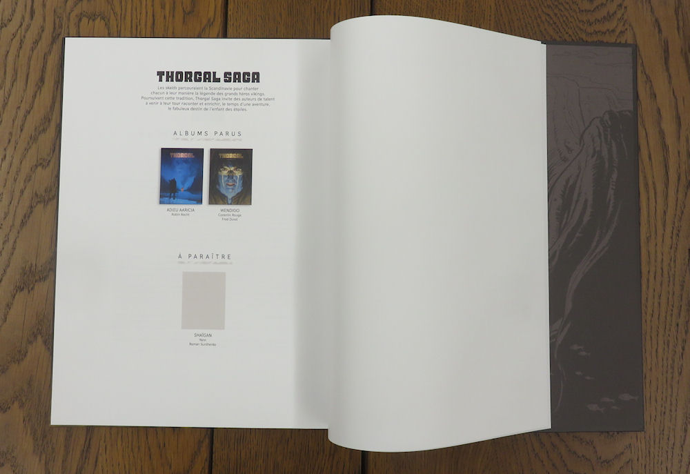 Gros et grand, l’album propose forcément des éléments complémentaires. Le premier est un frontispice imprimé sur papier cartonné, reproduisant l’une des magnifiques illustrations de l’album. Thorgal y est bien représenté, mais il faut le chercher !