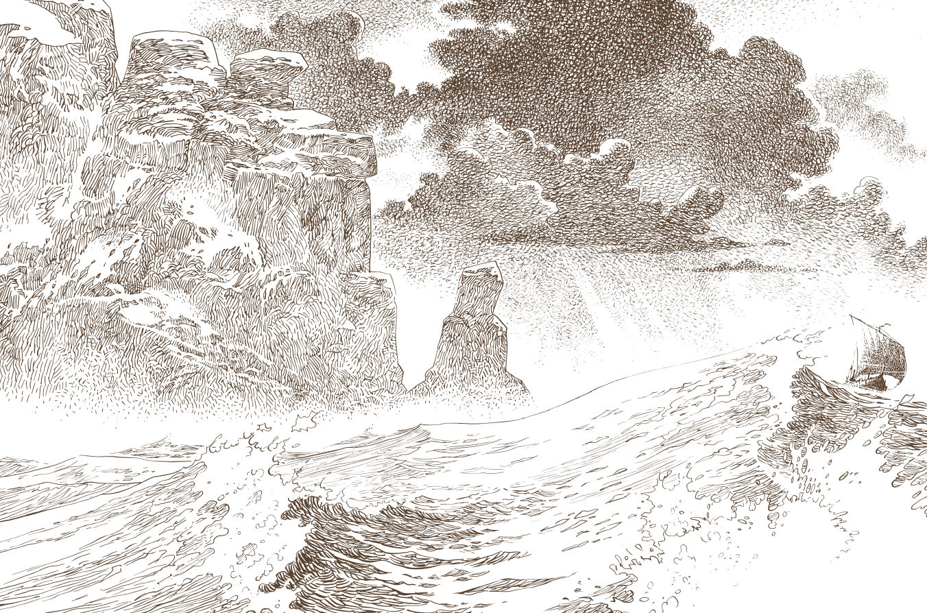 On retrouve tout au long de la série les fameux ornements à têtes de loups en or et en bois, les frises noires où s’entremêlent dragons et créatures imaginaires sur la 4ème de couverture, le crayonné d’un drakkar affrontant une mer tumultueuse (intérieur de couverture, cliquez pour agrandir)…