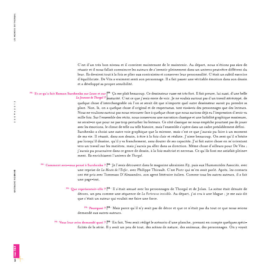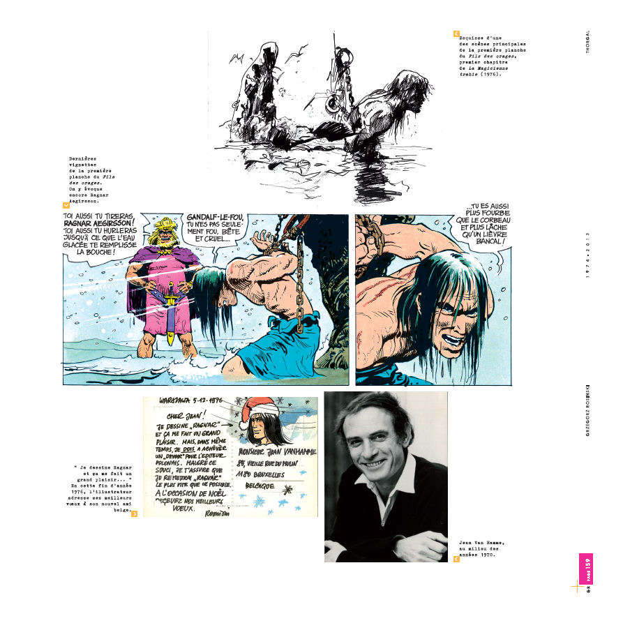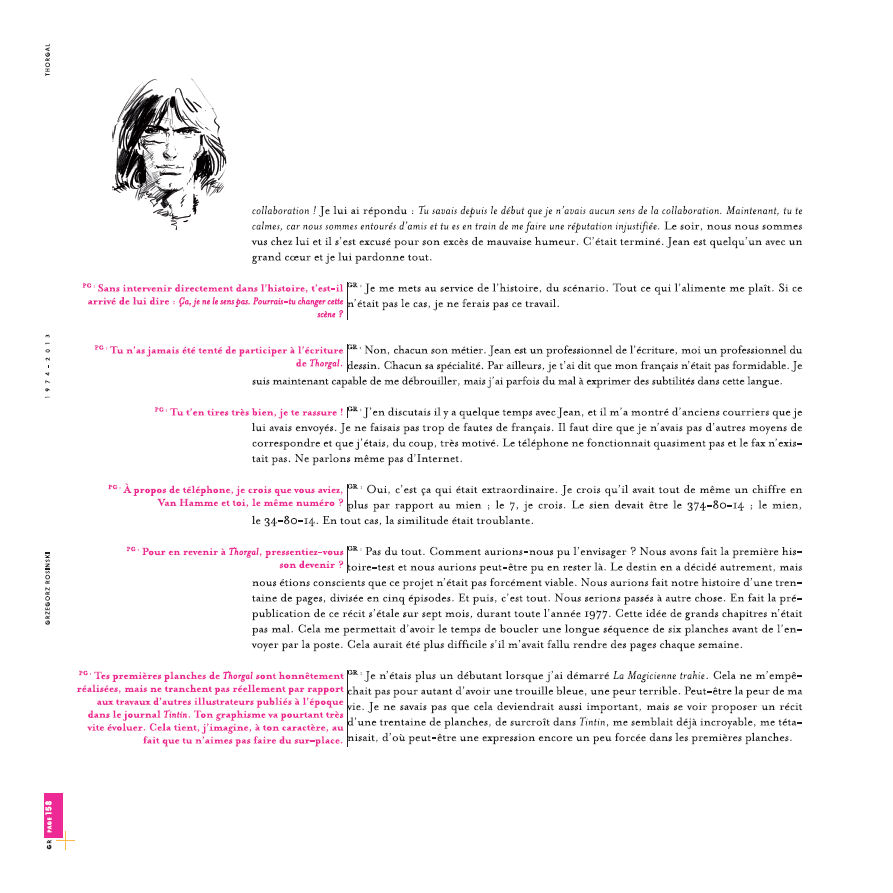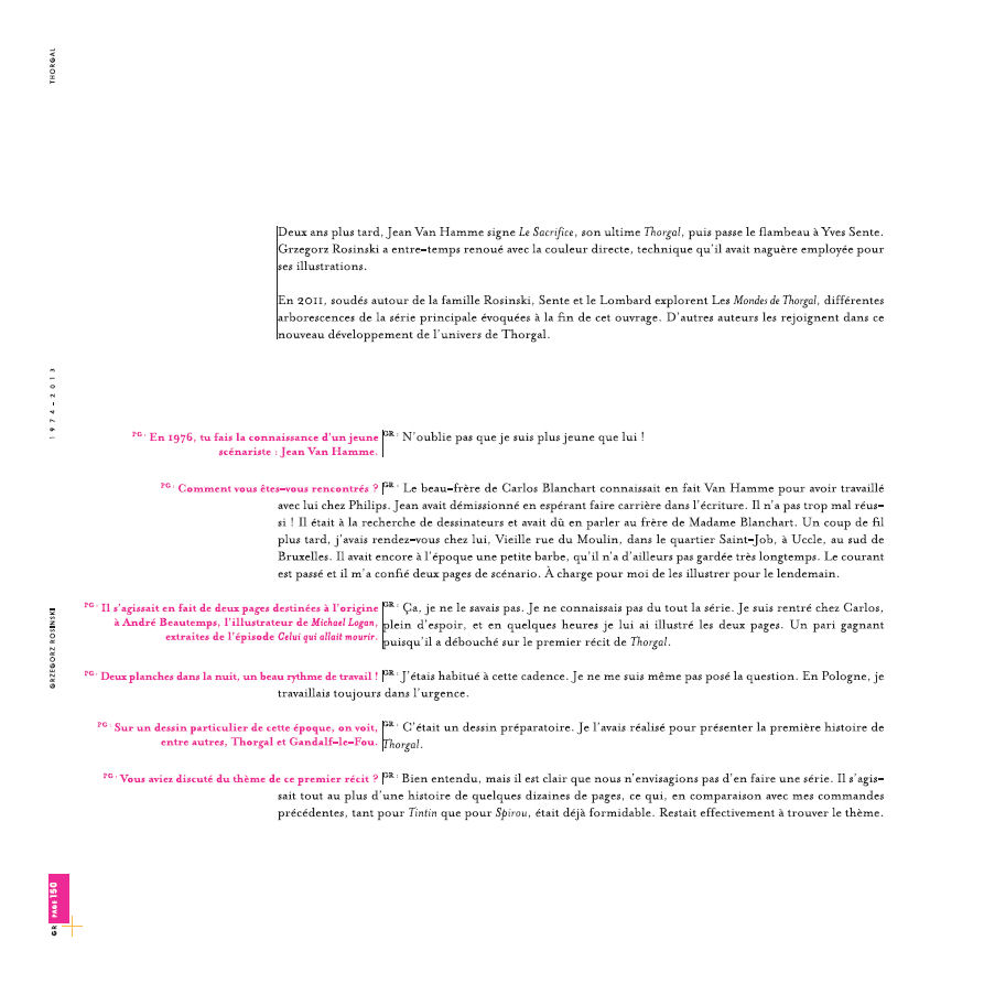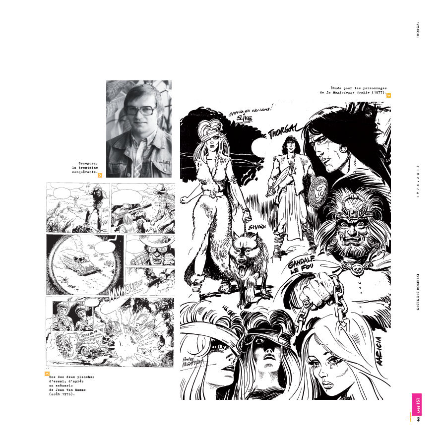Dans la monographie, 100 pages sont consacrées à Thorgal, de sa genèse bruxello-varsovienne au départ de Van Hamme. Les anecdotes y sont nombreuses, les deux auteurs n’étant d’ailleurs pas toujours d’accord. Deux égos qui se complètent malgré l’éloignement, les frontières, les barrières d’une langue et d’une culture différentes. Une alchimie qui va conquérir des dizaines de milliers de lecteurs.