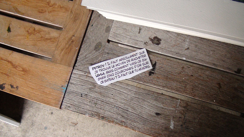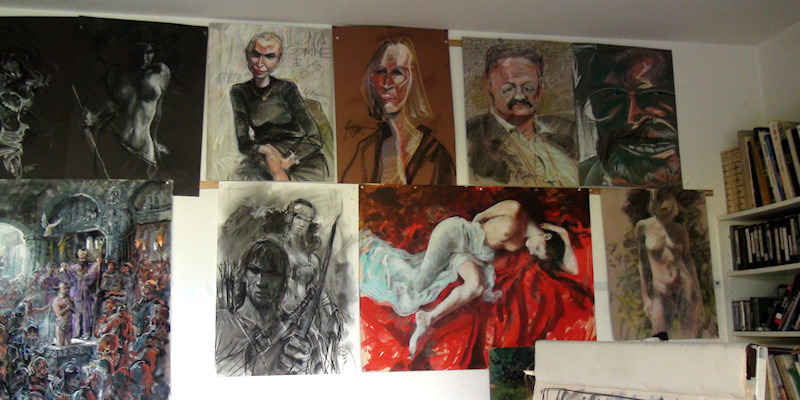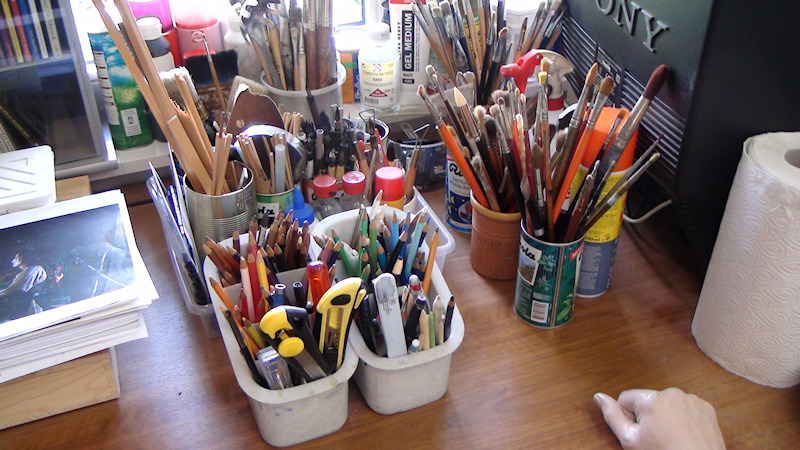 Beaucoup de matériel dans l'atelier du peintre... Beaucoup de documentation aussi, des photos, des esquisses, des idées griffonnées sur le papier.