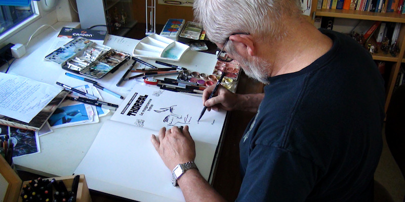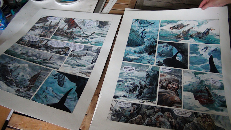 Les cases de la planche sont faites simultanément, la peinture sèche sur l'une pendant que le dessinateur travaille sur l'autre. Concentré à l'extrême, Rosinski entre dans sa création en occultant le monde qui l'entoure.