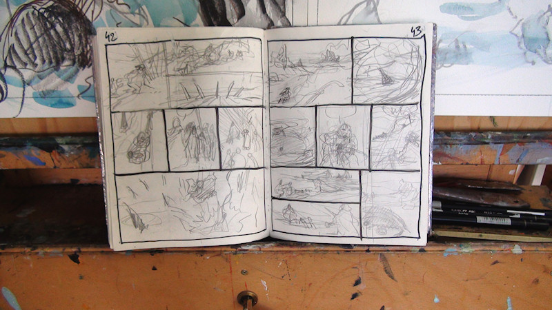 Ensuite, à la peinture et à l'encre, il esquisse les ambiances, personnages et arrières-plans. Le cadrage, les proportions et les postures sont cette fois quasi-définitifs.