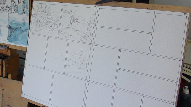 Les planches sont peintes intégralement, les bulles viendront plus tard, même si un espace leur est déjà plus ou moins réservé dans les cases. Cette première étape de peinture permet de donner sa tonalité à la planche, de lier les cases entre elles à la fois par le dessin, la lumière, la couleur.