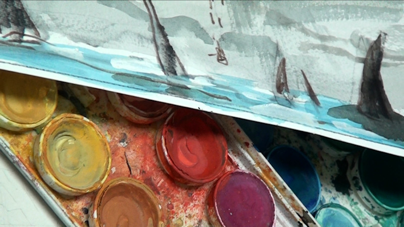 Installé sur un bureau, entouré d'une multitude de pinceaux, feutres, crayons... Rosinski commence à détailler les strips. Il passe d'un pinceau à l'autre, d'une couleur à l'autre, mais aussi d'une case à l'autre. Les couches de peinture se superposent, se mêlent, s'épousent.