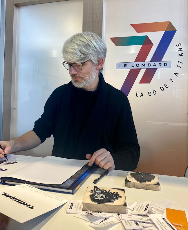 Robin Recht a dédicacé spécialement pour nous les albums qui seront envoyés dans quelques jours à nos cinq vainqueurs. Le voici au festival d’Angoulême, sur le stand du Lombard.