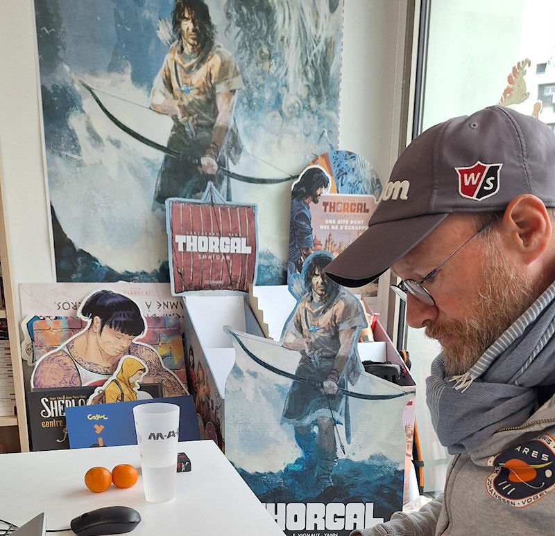 Le dessinateur de Thorgal est bien entouré, les héros du Lombard l’accompagnent dans sa tâche. Notamment l’un d’entre eux, un Viking au visage balafré…