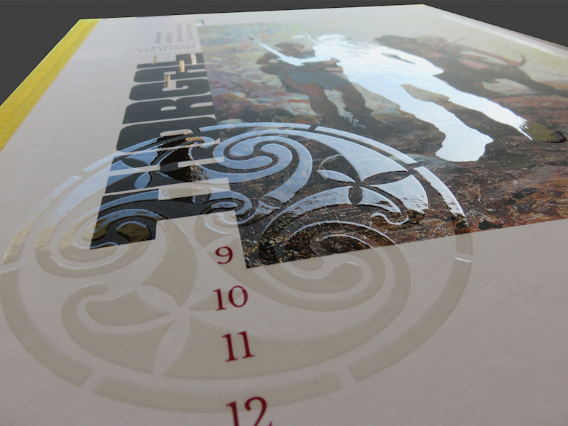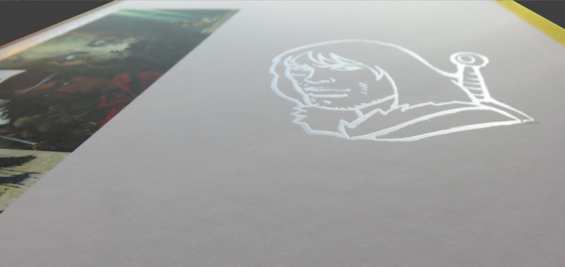 Le vernis sélectif est appliqué sur le titre Thorgal, mais aussi sur notre héros, au milieu de ses compagnons, ainsi que sur un symbole plus discret et une frise.