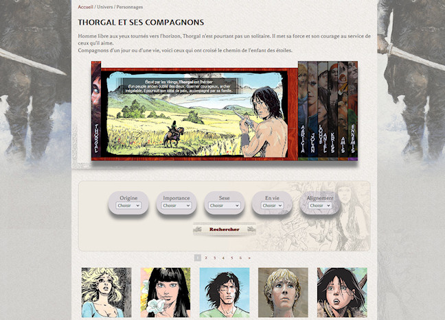 Un panneau interactif ouvre désormais la page et propose de découvrir en images et en textes les principaux héros de Thorgal. Une nouvelle interface de tri permet ensuite de sélectionner les personnages que vous voulez découvrir, en choisissant différents critères de recherche.