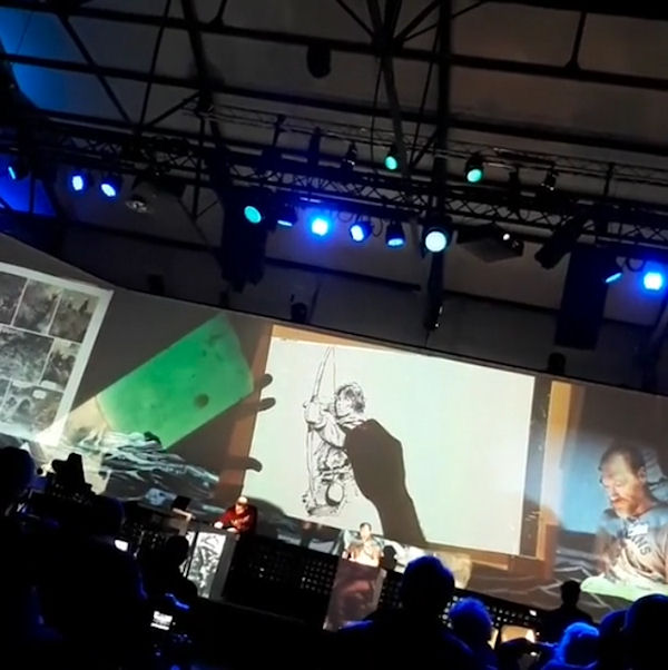 En dehors des dédicaces, les dessinateurs ont également participé à une performance publique projetée sur un grand mur d’écrans. Musique, images animées et dessin en direct, tout en feuilletant les pages des derniers albums, les auteurs et leurs dessins étaient mis à l’honneur, un beau spectacle ! Un court extrait est visible sur le forum.