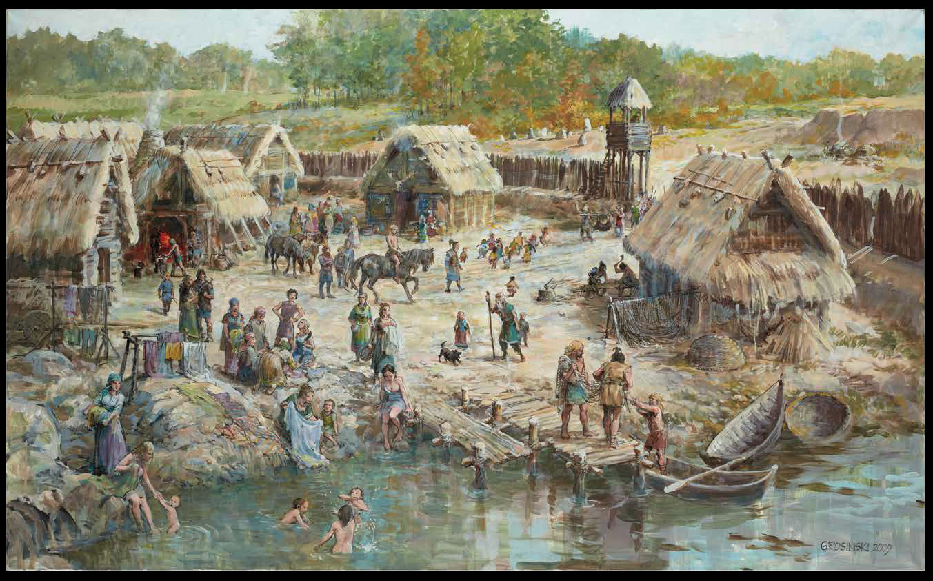 Parmi les autres œuvres présentées, il y avait ce tableau, superbe, une commande du Musée du Cinquantenaire à Bruxelles, datant de 2009. Un clin d’œil à Thorgal, Aaricia et Jolan s’est glissé dans cette scène de la vie d’un village mérovingien (cherchez bien, cliquez pour agrandir !).