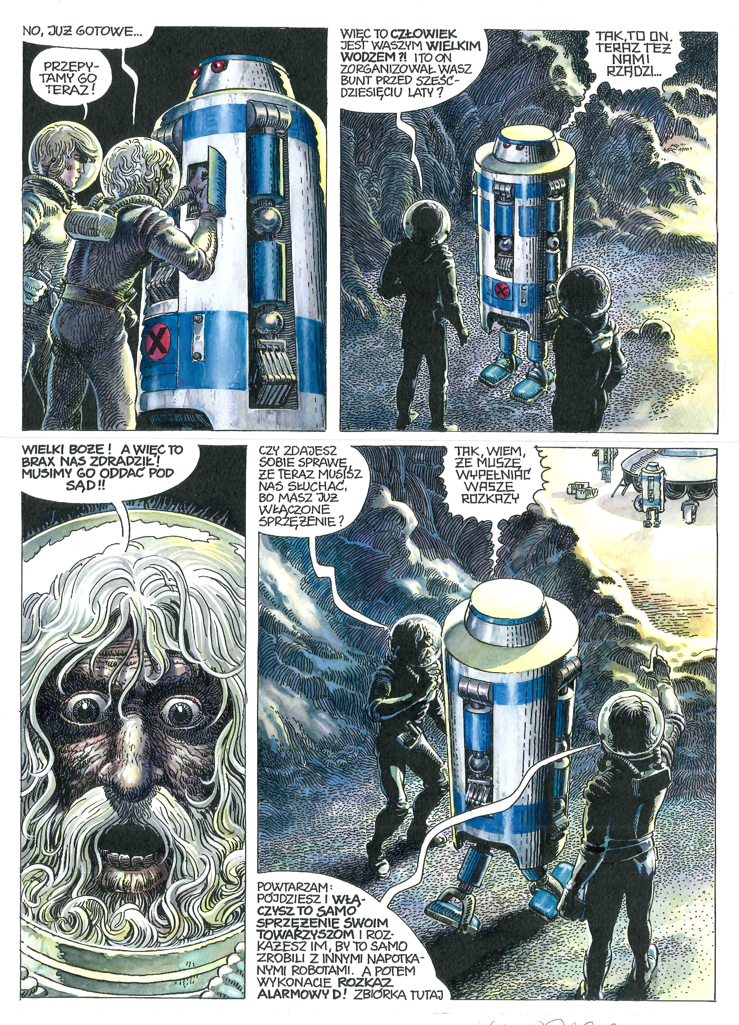 Je suis tombé sur une planche dessinée par Grzegorz Rosinski pendant sa période polonaise, avant qu’il n’entame les aventures de Thorgal (image d’origine en plus grande taille ici).