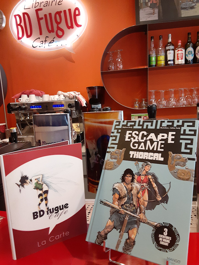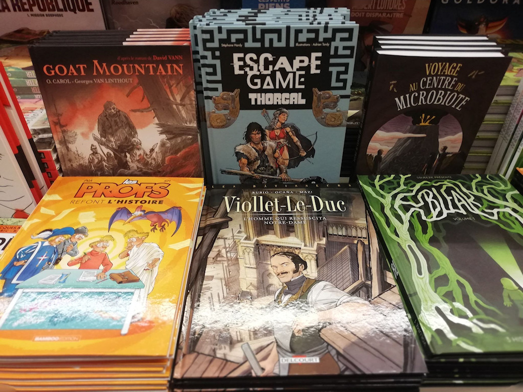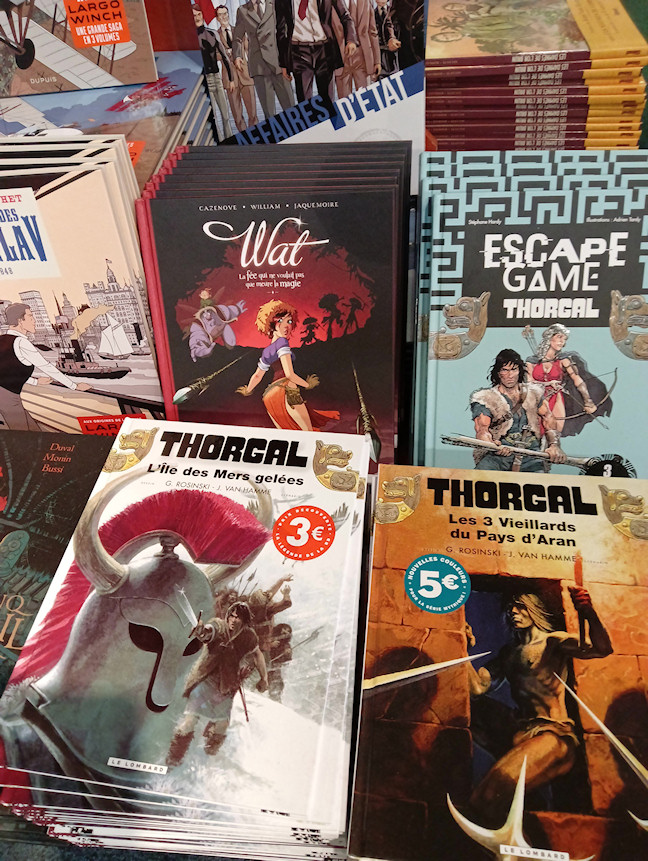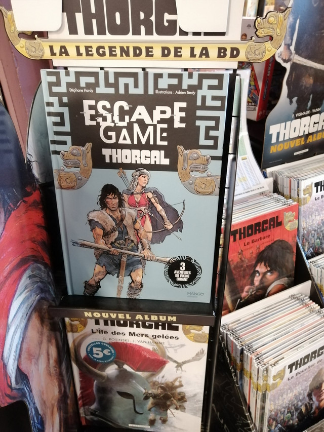 Ne croyez pas que les livres étaient présentés comme ça, ils étaient sur une seule pile. Mais pour la photo, j’ai viré les autres livres de jeux du premier niveau, et j’y ai étalé tous les escape game Thorgal, ça donne mieux, non ? Et le pire, c’est que j’ai laissé cette belle présentation en repartant !