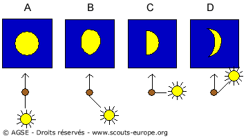 De nuit, tu vas utiliser la lune pour trouver l’emplacement du soleil. Regarde bien les schémas suivants. Si tu vois la pleine lune devant toi (A), c’est que le soleil est derrière toi. Si tu la vois dans son premier quartier (C), c’est que le soleil est à ta droite, etc…