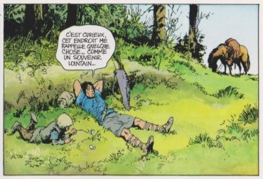 Les couleurs sont ternes, alors qu’on fête le Sumerblôt, l’arrivée des beaux jours. L’herbe devrait être bien verte, et les couleurs plus vives. Et surtout l’ombre de Gandalf devrait être visible. Lui et le iarl donnent l’impression de flotter car le contact avec le sol n’est pas du tout marqué. En plus, tout le poids de Gandalf porte sur son pied posé sur la cape du iarl, et aucune trace n’est visible sur cette cape.A titre de comparaison, j’ai pensé au moment où Thorgal s’est allongé dans l’herbe avec Jolan, là où Tjahzi l’avait fait passer de l’autre côté dans la gardienne des clés. La différence est évidente.