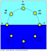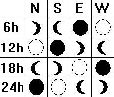 Il suffit de regarder où en est la lune aux heures suivantes, par exemple si à minuit elle est pleine (24h et blanche sur le schéma) alors elle indique le Sud. Un autre exemple, si à 18h00, il y a le dernier quartier descendant, elle indique le Nord, et ainsi de suite.Source : http://montagneloisir.chez-alice.fr/guideorient.htm%5B/t:b522927ebe%5D