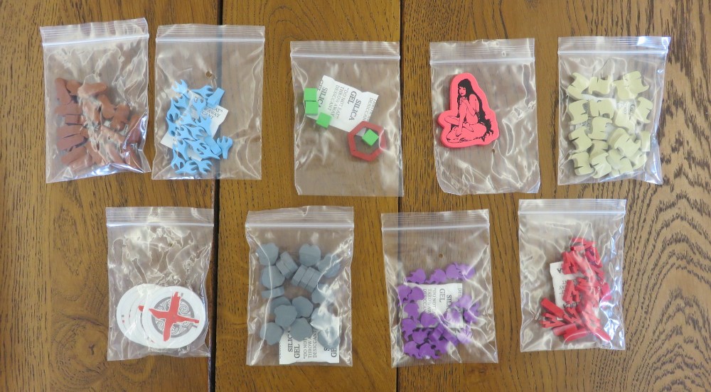 Allez on reprend avec une bonne dose de sachets, contenant des tonnes de pions en bois. Le pion en bois, dans le monde du jeu, c’est le beau custom qui fait plaisir. C’est beau, c’est costaud, ça a des formes variées et immersives.