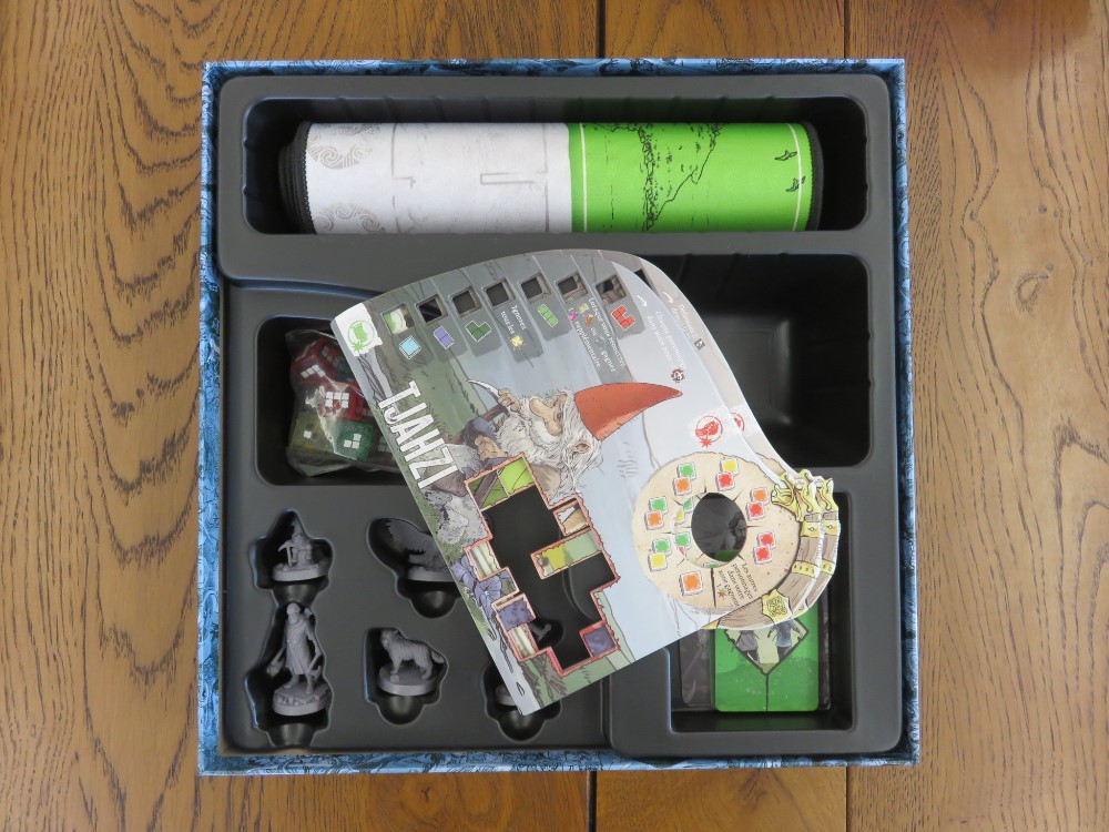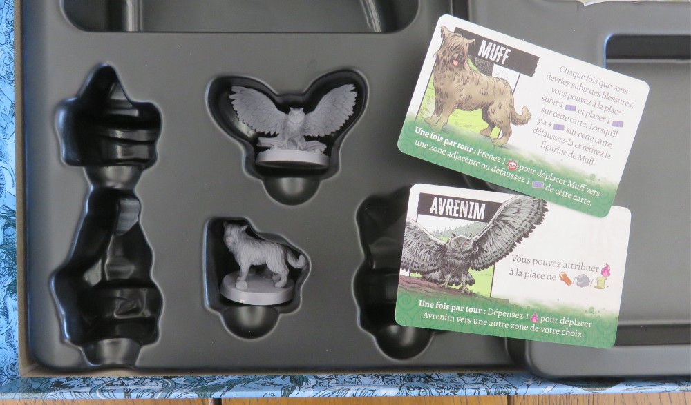 Et voici l’explication du pourquoi qu’il y a des trous dans la « promo box » : on peut y placer les trois figurines de l’extension, ainsi que le tapis de jeu et les plateaux.