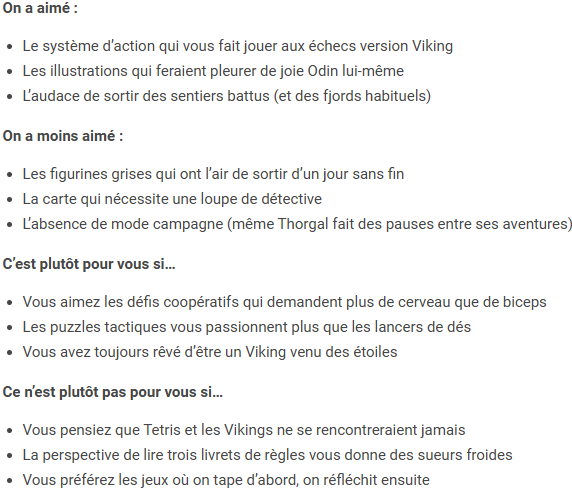 « Portal Games a pris des risques, et ça se sent. Thorgal n’est pas le jeu parfait que certains espéraient, mais il a le mérite d’essayer quelque chose de différent. On tient ici un jeu qui divise autant qu’il intrigue.