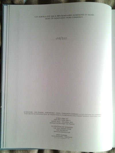 Pourtant, aucune signature sauf sur la Litho n’est présente. Il me semble que d’habitude les bds numérotées sont signées sur la page comportant le nombre de tirage mais pas sur une litho collée une page avant…