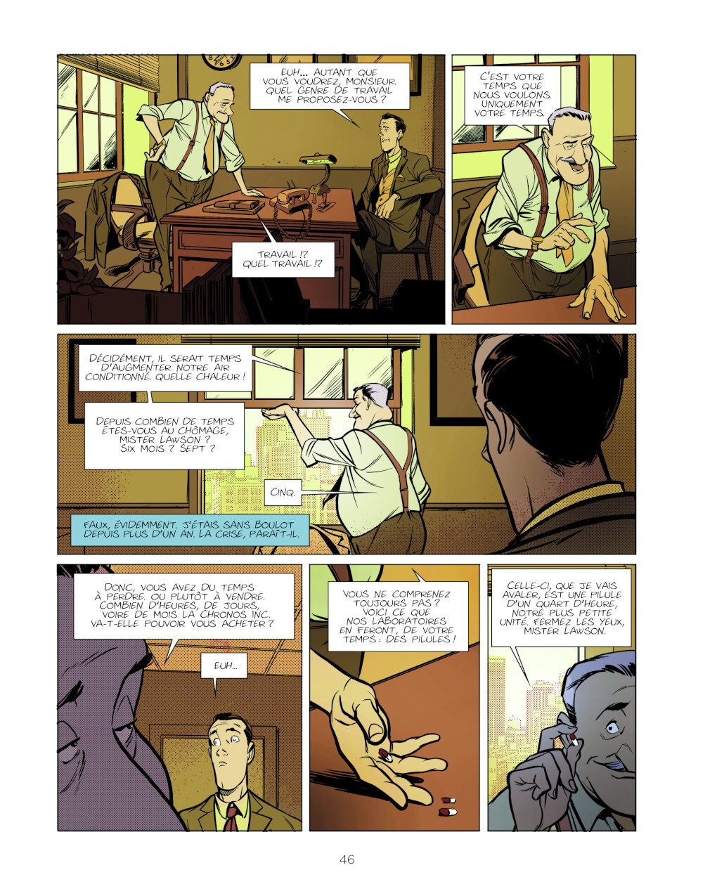 Il en sera de même pour le directeur général adjoint de la Chronos Incorporated, personnage aussi savoureux qu’imbu de lui-même et de son invention : une petite pilule censée arrêter le temps. Illustrée par Jose Luis Munuera, qui co-pilote par ailleurs les aventures de Spirou & Fantasio, Les bretelles (c’est le nom de cette nouvelle) se révèle être une étonnante fiction !